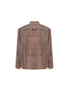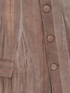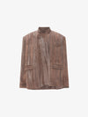 Cut in a relaxed silhouette, this jacket features a distinctive washed wood-grain effect that creates natural vertical lines throughout the fabric. The mandarin collar and rounded covered buttons highlight its minimal, sculptural look, while the asymmetrical front panel gives it a soft modern edge. A refined piece designed for effortless structure and movement.