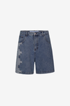 A structured denim short designed with a bold zigzag contrast panel along the side, adding a distinctive edge to a classic silhouette. Finished with a high-rise waist, five-pocket construction, and a signature leather back patch.