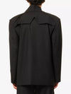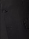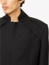 This tailored blazer features a clean, minimal front closure balanced by a sculpted stand collar and angular shoulder construction. Designed with a sharp, architectural silhouette, it offers a refined take on contemporary tailoring. Finished with flap pockets, fabric-covered buttons, and signature panel detailing at the back.