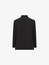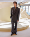 A relaxed, elongated tailored jacket designed with a clean double-breasted closure and fabric-covered buttons for a seamless minimalist look. The silhouette features softly structured shoulders and a slightly extended lapel, giving the piece a modern architectural presence. The fit remains fluid while maintaining sharp lines, with subtle front welt pockets and a chest pocket completing the design.