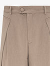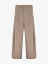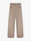 Wide relaxed trousers inspired by traditional hakama shape, featuring soft pleated volume and clean side panel construction. Finished with a structured waistband, covered button closure, and welt back pockets.