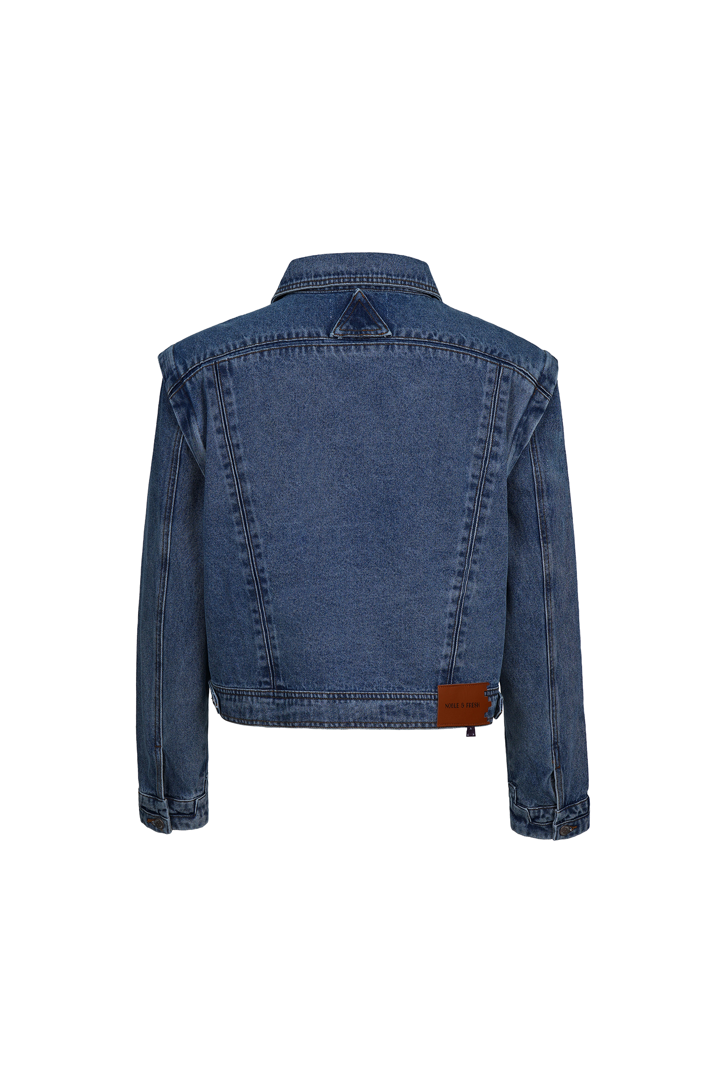A structured denim jacket designed with a cropped silhouette and a signature zigzag front placket that adds dimension to the classic denim shape. The shoulders feature concealed zippers, allowing the sleeves to be fully detached and transforming the piece into a sleeveless vest. Finished with flap chest pockets, side welt pockets, and contrast stitching for a modern, versatile look.